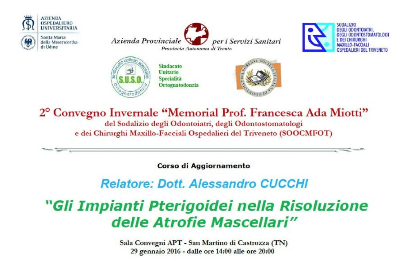 Corso di aggiornamento "Gli impianti pterigoidei nella risoluzione delle atrofie mascellari", relatore dott. Alessandro Cucchi