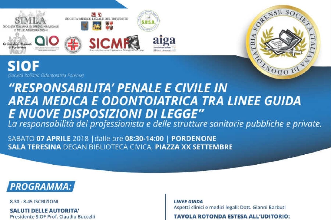 Sabato 7 aprile nella sala Teresina Degan della Biblioteca Civica di Pordenone (Piazza XX Settembre) la Società Italiana Odontoiatria Forense (Siof) organizza il congresso “Responsabilità penale e civile in area medica e odontoiatrica tra linee guida e nuove disposizioni di legge” - La responsabilità del professionista e delle strutture sanitarie pubbliche e private. Con il patrocinio di: Ordine Medici di Pordenone, Ordine degli Avvocati di Pordenone, Suso, Aio, Simla, Sicmf, Smlt, Aiga. Il congresso è gratuito e rivolto a medici, odontoiatri, medici legali, avvocati ed igieniste dentali. La frequenza dell’evento formativo è valida per l’attribuzione di 6 crediti formativi per l’area medica e di 3 crediti formativi per gli avvocati.
