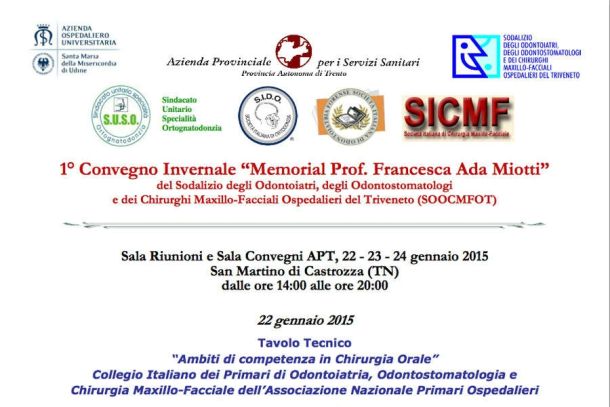 A San Martino di Castrozza (TN) il 22, 23 e 24 gennaio 2015 si svolge il 1° Convegno Invernale “Memorial Prof. Francesca Ada Miotti” del Sodalizio degli Odontoiatri, degli Odontostomatologi e dei Chirurghi Maxillo-Facciali Ospedalieri del Triveneto (SOOCMFOT). Presso la sala riunioni e la sala convegni APT, dalle ore 14 alle ore 20. Organizzato da SOOCMFOT con Azienda Ospedaliero-Univ…