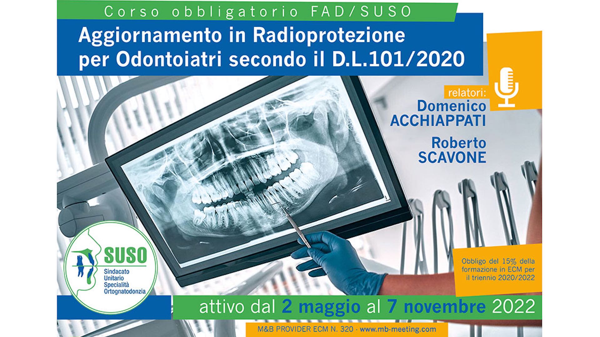 Il S.U.S.O., Sindacato Unitario Specialità Ortognatodonzia, organizza dal 2 maggio al 7 novembre 2022 il corso (FAD asincrona) “Aggiornamento in Radioprotezione per Odontoiatri secondo il D.L.101/2020”. Il corso di aggiornamento è obbligatorio per chi fa radiografie in attività di tipo "complementare" (gli Odontoiatri). L'art. 162 del Decreto legislativo 101/2020 dispone che il 15% della formazione in ECM per il triennio 2020/2022 sia dedicato alla radioprotezione: "I crediti specifici in materia di radioprotezione devono rappresentare almeno il 10 per cento dei crediti complessivi previsti nel triennio per i medici specialisti, i medici di medicina generale, i pediatri di famiglia, i tecnici sanitari di radiologia medica, gli infermieri e gli infermieri pediatrici, e almeno il 15 per cento dei crediti complessivi previsti nel triennio per gli specialisti in fisica medica e per i medici specialisti e gli odontoiatri che svolgono attività complementare"