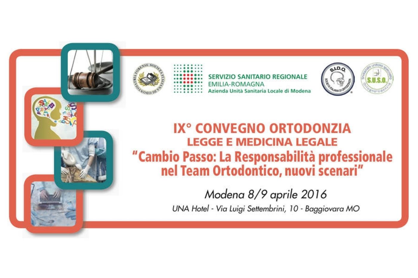 A Modena l'8 e il 9 aprile (Una Hotel - Baggiovara) si tiene il IX° Convegno Ortodonzia Legge e Medicina Legale “Cambio Passo: La Responsabilità professionale nel Team Ortodontico, nuovi scenari”. Le due vere novità di quest’anno sono, da una parte quella scientifica e medico legale che vede rappresentare il ventaglio dei consulenti che lavorano al fianco e sotto la regia attenta dell’ortodonista che dà una prestazione di eccellenza. Si impone infatti una conoscenza rigorosa di quali strutture gestionali ospitano i professionisti e quindi ne regolano i rapporti di collaborazione, per poter mantenere il rispetto delle regole deontologiche e medico legali che oggi la professione impone con i nuovi scenari professionali. L’altra novità, l’ospitalità del Sindacato degli Ortodontisti, il SUSO, che festeggia i suoi primi 40 anni (1976/2016) e sabato mattina presenta il libro storico “La Cittadella, Storia dell’Ortodonzia Italiana"