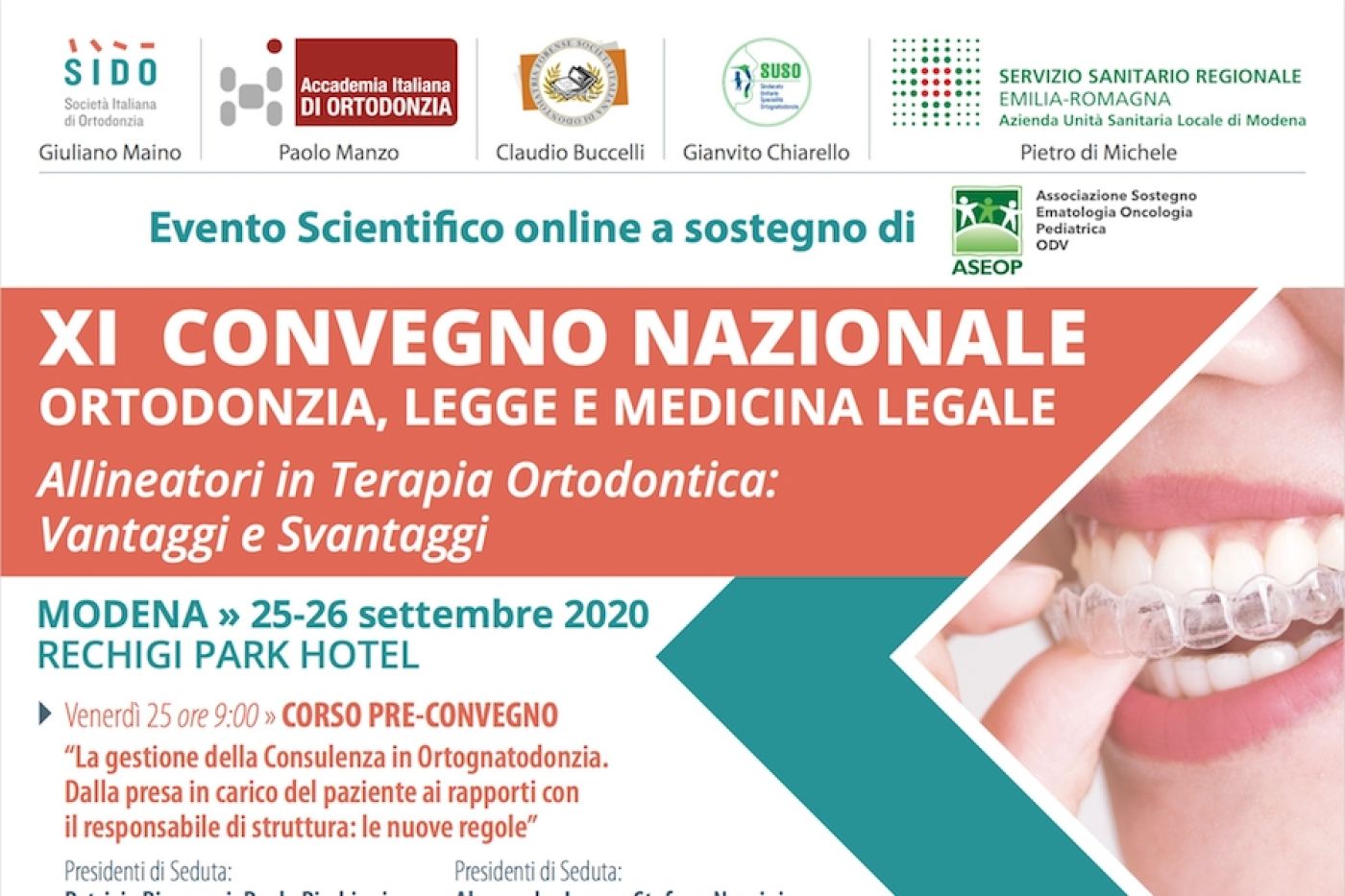 L’evento è organizzato in condivisione con la SIDO (Pres. Giuliano Maino), l’Accademia Italiana di Ortodonzia (Pres. Paolo Manzo), la SIOF (Pres. Claudio Buccelli), dal SUSO (Pres. Gianvito Chiarello) nonché dal Servizio Sanitario Regionale Emilia Romagna - Azienda Unità Sanitaria Locale (Pres. Pietro Di Michele).
